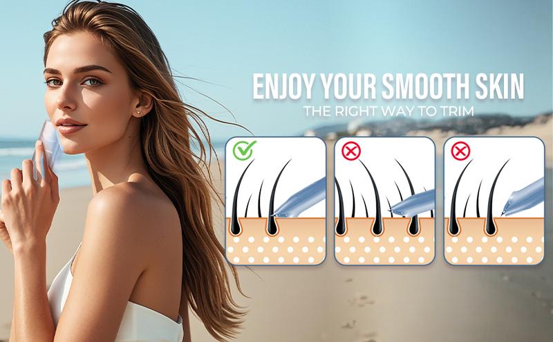 This multi-functional personal care kit has the following features: - 2-in-1 design: Akunbem women electric shaver double-head design, integrates both body hair trimmer and facial hair trimmer. - Safe and effective: bikini trimmer for women effortlessly removes hair. - High performance: a powerful motor ensures smooth trimming, and the soft blades provide a painless shaving experience while protecting the skin. - Diversified grooming options: womens electric shaver for legs, arms, body, armpits, face and bikini areas, leaving no residue behind. - Easy to clean: the washable and detachable heads make cleaning and maintenance effortless. - Rechargeable and portable: USB charging for speed and convenience. Charge for up to 90 minutes of cordless use. Ideal for women, this electric shaver is a great gift for partners, girlfriends, mothers, relatives, and friends. It's waterproof, so you can use it in wet or dry conditions. It's also skin-friendly, preventing scratches and cuts. - Universal grooming solution: bikini trimmer with two high-efficiency shaving heads for different body parts. Shaver Usage Guide