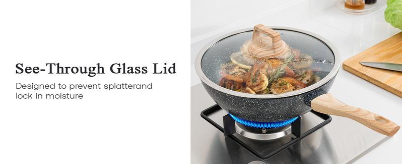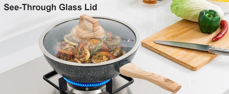 - Durable Bakelite Handle: With heat-resistant properties allow you do not worry about burning fingers in picking up the pots and pans. Perspective glass lid ergonomic design allow you to check the status of the food in the pot in time.