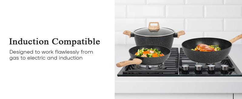 - Compatible with All Stovetops: From gas to electric and induction, non stick cookware set are designed to work flawlessly on any cooktop.