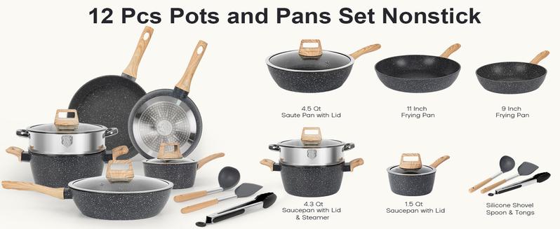 - Versatile Cooking Set: SODAY 12 pcs kitchen cookware set includes 9 inch/11 inch frying pans, 11 inch/4.5QT saute pan with lid,4.3 QT saucepan with lid and steamer,1.5 QT saucepan with lid and silicone shovel spoon & tongs ideal for your daily cooking